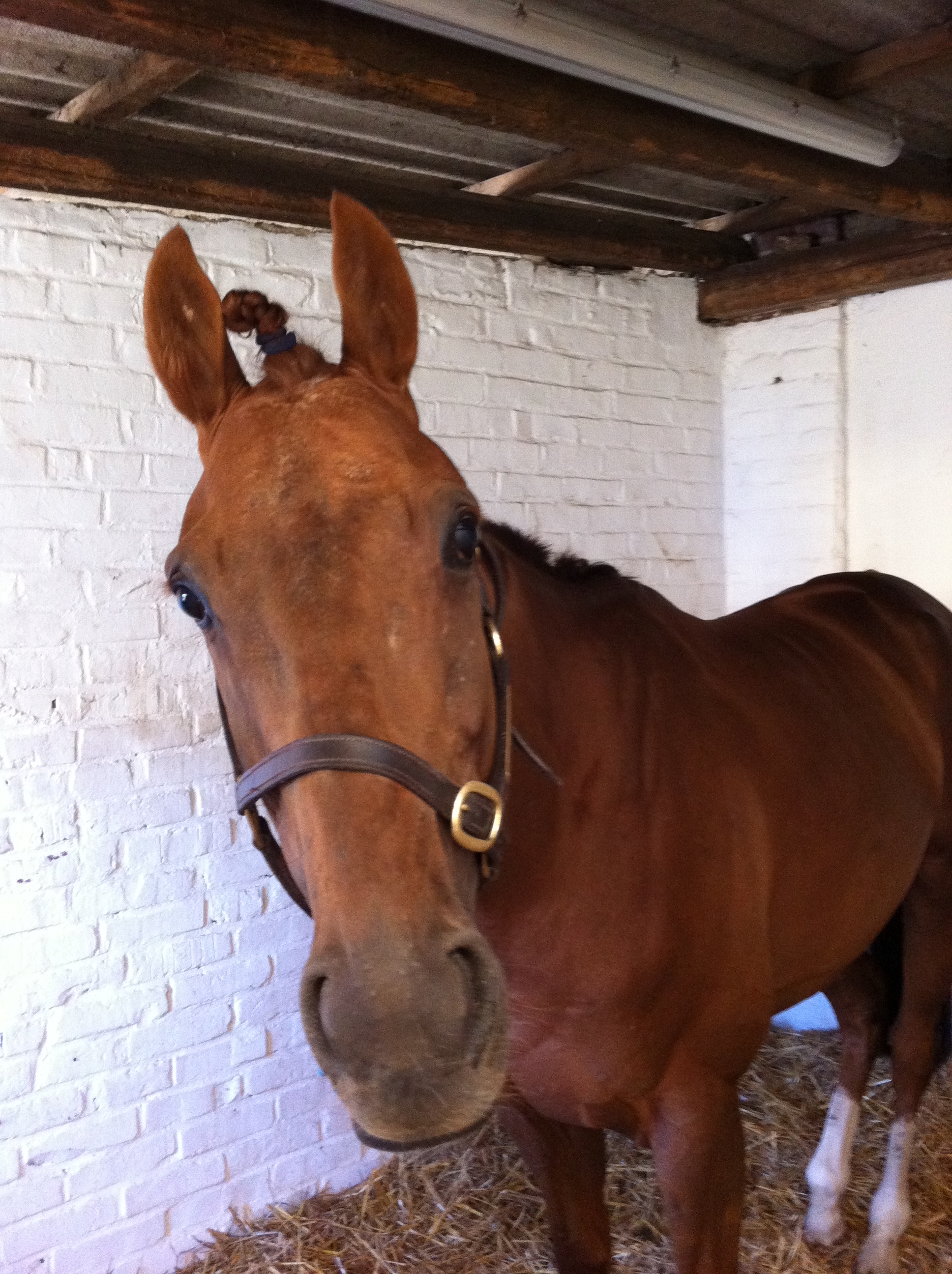 So sehen Sieger aus – schalalalala 😉 Großer Jubel nach EGONs Auswärtssieg zum Saisonauftakt nach 9monatiger Rennpause. Wo kann man als Kölner = „gefühler Immer-Meister“ besser starten als in der Stadt des Deutschen Fußballmeisters, in Dortmund. Auf extrem abgetrocknetem Boden (Skala 2,8: „fest“) hat es EGON hinten raus spannend gemacht, aber auch Jockey Andreas Göritz war sich stets sicher: das verlieren wir heute nicht. So kanns weitergehen. Aber jetzt wird erstmal gefeiert! EGON nach dem Rennen topfit, in Erwartung einer Siegerportion Äpfel…