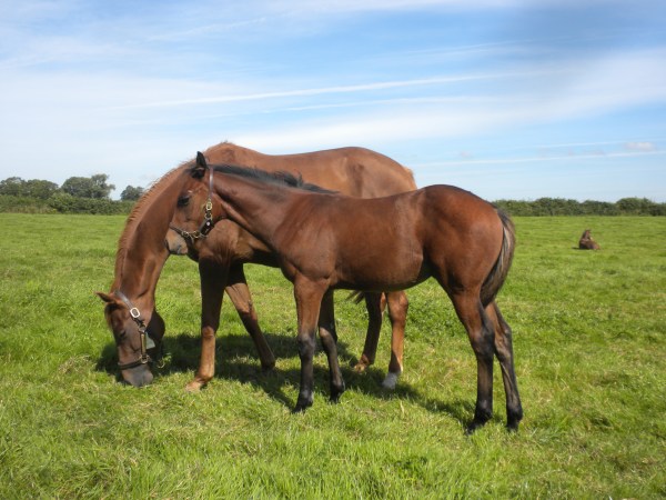 Sonne in Irland! Dieser Moment musste genutzt werden, um ein neues Foto von Ronja und ihrem auch im Regen wunderbar gedeihenen Fohlen zu machen. Hier, so hoffen wir, reift ein Talent heran. Damit Irland auch in Zukunft nicht nur für sportlichen Erfolg im olympischen Frauenboxen, sondern weiter auch für die Aufzucht toller Rennpferde steht.