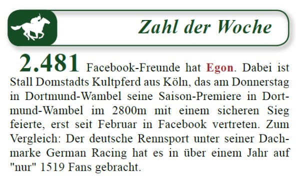 EGONs Facebook-Seite erfreut sich stark wachsender Beliebtheit. Die Turf-Times berichtete Anfang Juni in ihrer Rubrik „Zahl der Woche“ über 2.481 Fans von EGON; jetzt sind es bereits deutlich über 2.500. Wie, selbst noch nicht Fan von EGON auf Facebook? Einfach unter facebook.com/stalldomstadt auf „Gefällt mir“ klicken. Macht Spaß!